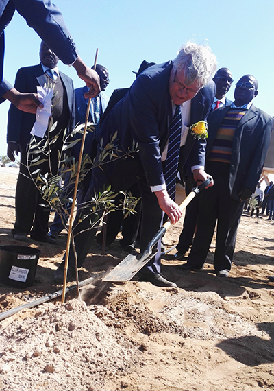 Turun yliopiston rehtori Kalervo Väänänen istuttaa ensimmäisiä oliivipuita Namibian yliopiston meribiologian kampusalueelle Hentis Bayssa, jonne luodaan pienempi puualue kastelujärjestelmän testaamiseksi.