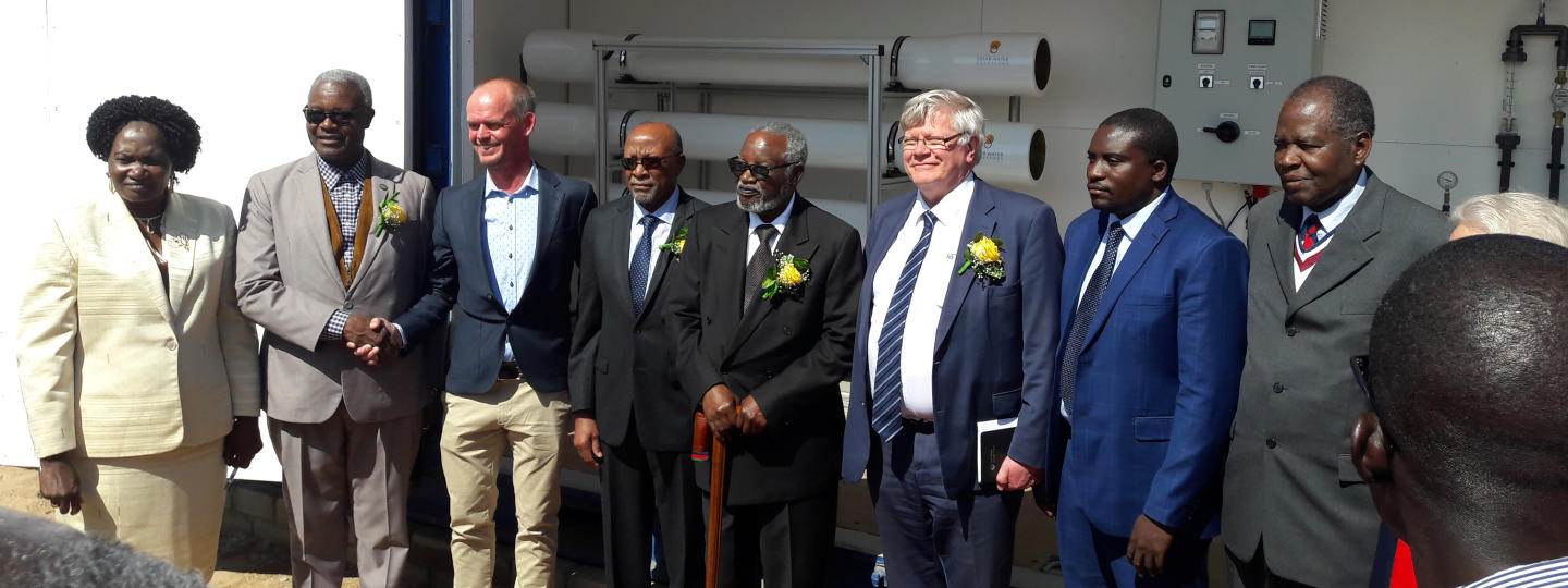 Kuvassa avajaistilaisuuden kunniavieraat (vasemmalta oikealle): Namibian Minister of Higher Education Itah Kandjii-Murangi, Minister of Agriculture, Water and Forestry Alpheus G. !Naruseb, Solar Water Solutions -yrityksen johtaja Julius Pohjola, Namibian varapresidentti Dr. Nangolo Mbumba, Namibian ensimmäinen presidentti, "Father of the Namibian Nation" Dr. Sam S. Nujoma, Turun yliopiston rehtori Kalervo Väänänen, Namibian yliopiston rehtori Kenneth Kamwi Matengu, Namibian yliopiston emeritusrehtori Lazarus Hangula.