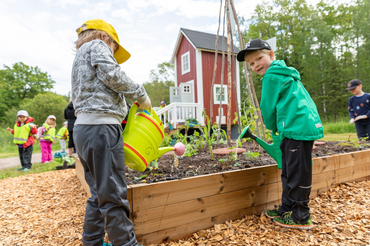 Rehtoripellon päiväkodin lapsia istuttamassa kasveja Kalervon kasvimaalla. Kuva: Hanna Oksanen