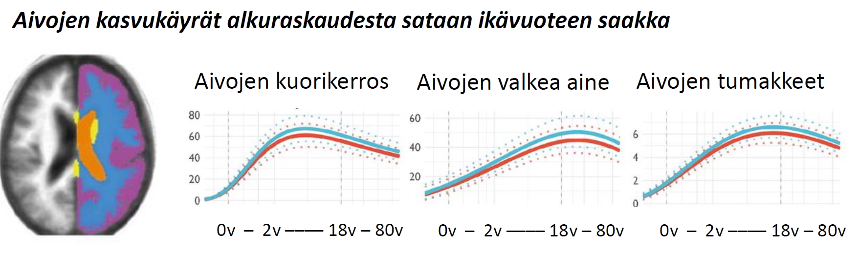 Aivojen huimasta kehityksestä kertoo se, että aivojen koko kasvaa raskausjasta kolmeen ikävuoteen mennessä noin 70 prosenttia. Aivojen kasvuvauhdin vaihtelut ovat avaintietoa kaikessa tulevassa tutkimuksessa. Esimerkiksi aivojen kuorikerroksen kasvu loppuu jo lapsuusaikana, aivojen harmaan aineen tumakkeet kasvavat noin 18 ikävuoteen saakka ja valkean aineen kasvu ulottuu 30 ikävuoteen saakka.
