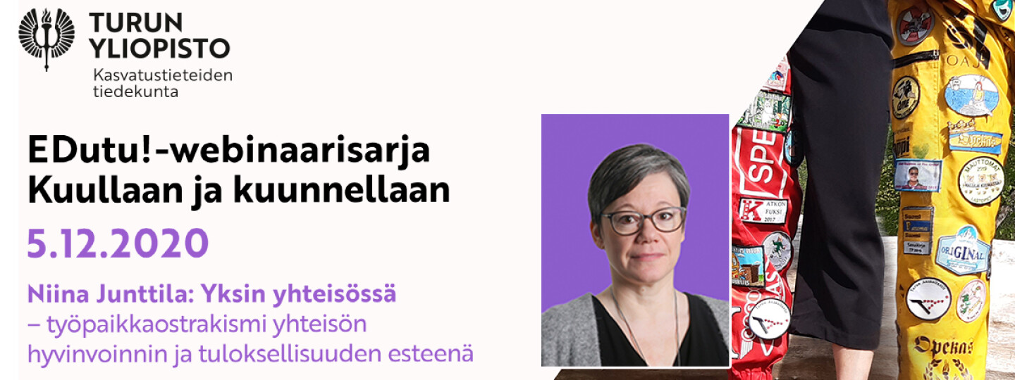 Yksi suurimmista työhyvinvoinnin syöpöistä on työpaikkaostrakismi, eli tapa, jossa joku työkavereista jätetään yhteisen toiminnan ulkopuolelle. Turun yliopiston kasvatustieteiden tiedekunnan EDUtu!-webinaarissa Suomen johtava yksinäisyystutkija, kasvatuspsykologian professori Niina Junttila avaa ilmiötä. Puheenvuorojen jälkeen asiasta keskustellaan yhdessä.
