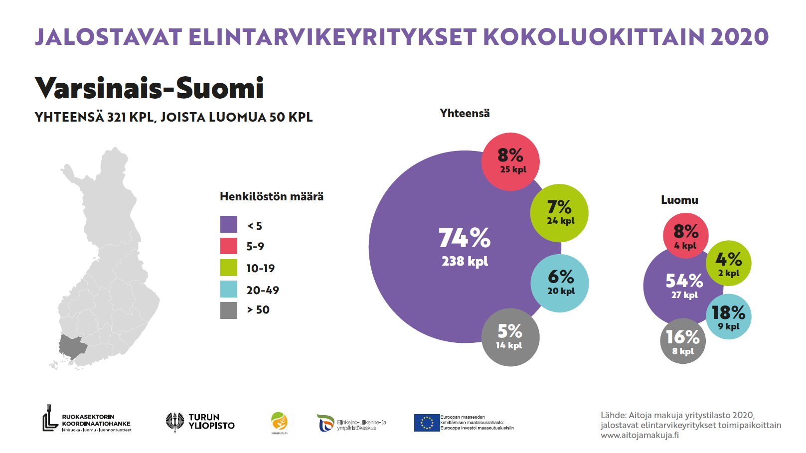 Koko maakunnan liikevaihdosta 15 prosenttia muodostuu ruokaketjusta ja kaikista maakunnan toimipaikoista viidennes kuuluu ruokaketjuun. Sen suora työllistävä vaikutus on jopa 16 000 henkilöä (Tilastokeskus 2017). Elintarvikkeita ja juomia valmistavia yrityksiä on lukumäärässä mitattuna Varsinais-Suomessa yhteensä 321 yritystä (Aitoja makuja yritystilasto 2020).