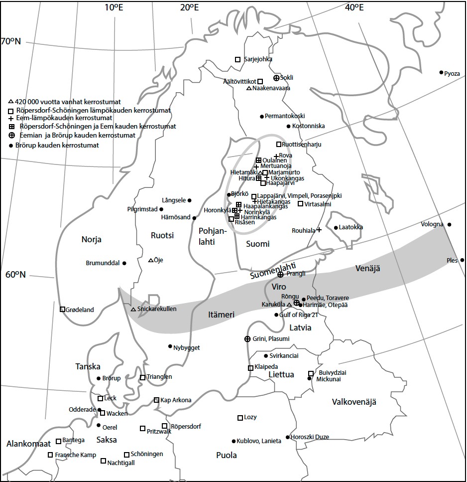 Kartassa on esitetty Luoteis-Euroopan paikkakunnat, joissa on viimeisen 420 000 vuoden ajalta säilyneitä kerrostumia eri lämpökausilta. Kartan soikio rajaa Pohjanmaan runsaat esiintymät, joita tutkimuksessa on lähemmin tarkasteltu. Leveä harmaa länsi-itä-suuntainen vyöhyke kuvaa aluetta, jossa boreaalisen mäntymetsän pohjoisrajan on tutkimuksessa tulkittu sijainneen Brörup-lämpökaudella noin 100 000 vuotta sitten. Kuva: Matti Räsänen.