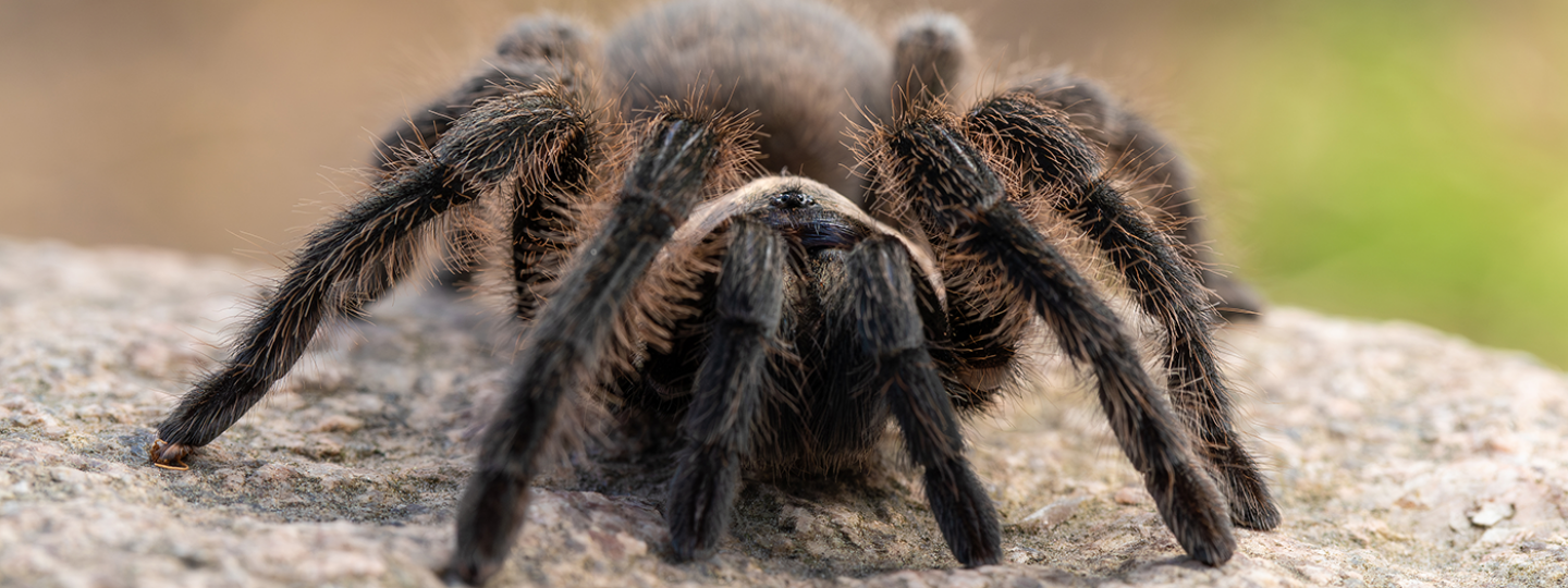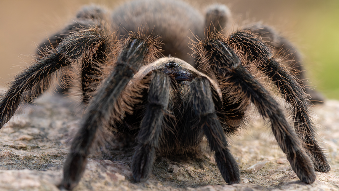 Hiljattain löydetty tarantulalaji Chaetopelma persianum, jota kutsutaan yleisesti Persian kultatarantulaksi. Alemmassa kuvassa tarantula on puolustusasennossa. Kuvaaja: Kari Kaunisto, Turun yliopisto.