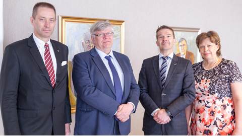 LähiTapiola Varsinais-Suomen toimitusjohtaja Olli Aakula, Turun yliopiston rehtori Kalervo Väänänen, Turun yliopiston kauppakorkeakoulun dekaani Markus Granlund ja LähiTapiola Varsinais-Suomen hallituksen puheenjohtaja Ulla-Maija Moisio lahjoitustilaisuudessa Turun yliopistolla 2.6.2017.