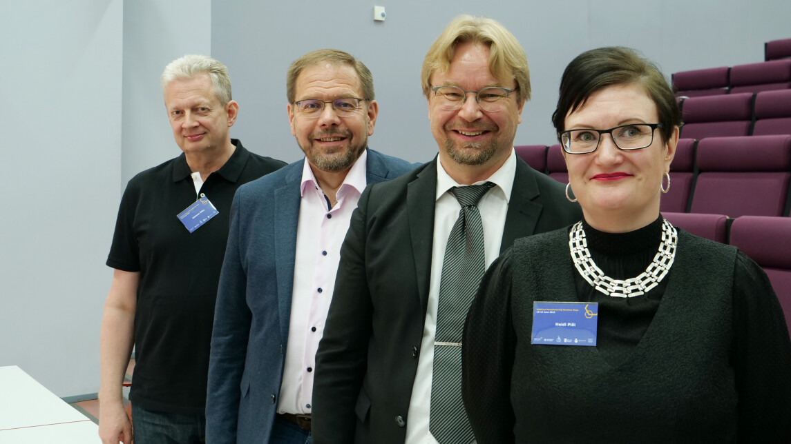 Kuvateksti: Lisäävän valmistuksen seminaari sujui hyvin, kertovat tapahtuman järjestäjät (vas.) yliopettaja ja tutkimusvastaava Mika Jokinen Turun AMK:sta, Turun yliopiston konetekniikan professori Antti Salminen, Turun AMK:n koulutus- ja tutkimuspäällikkö Mika Lohtander ja Turun yliopiston konetekniikan erikoistutkija Heidi Piili.