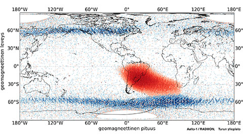 Aalto-1:n kantaman RADMON-säteilyilmaisimen mittauksia kartalla. Kuvassa näkyy säteilyvuon intensiteetti Aalto-1:n kiertoradalla eli noin 510 kilometrin korkeudella maanpinnasta, lokakuun ja tammikuun välisenä aikana. Punaiset pisteet kuvaavat protonisäteilyn intensiteettiä ja siniset elektronisäteilyn intensiteettiä; mitä tummempi piste, sitä voimakkaampi intensiteetti. Maantieteellisten koordinaattien sijaan tutkijat käyttivät geomagneettisia koordinaatteja, joissa navat ovat Maan magneettiset navat.