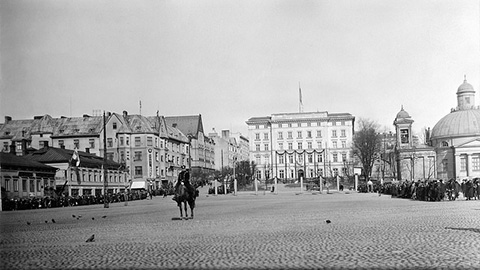 Kuvassa Turun yliopiston vihkiäisjuhla ja ensimmäinen promootio 12. toukokuuta 1927. Yleisöä Aurakadulla ja Kauppatorilla.