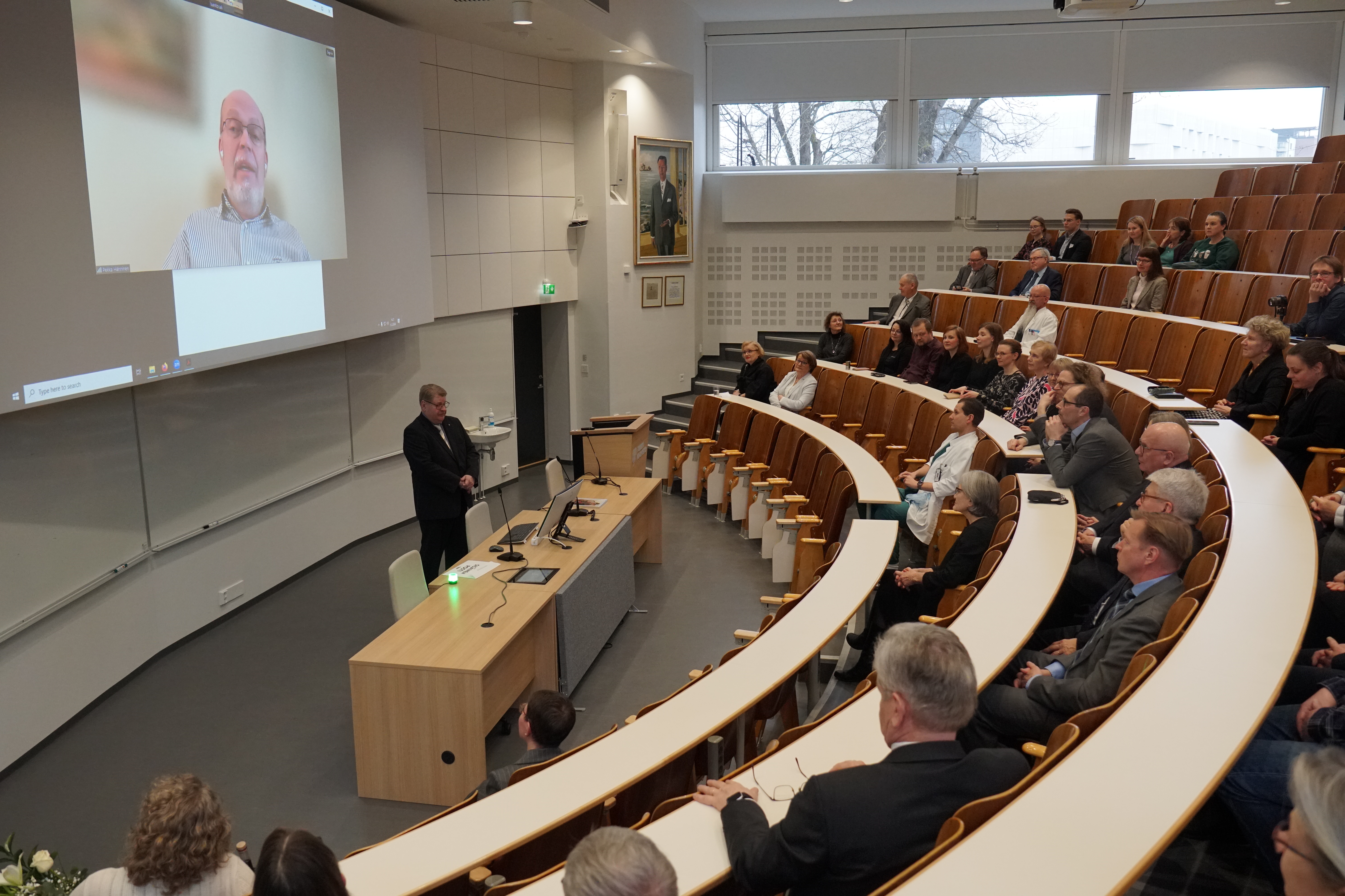 Seminaarin avasi biolääketieteen laitoksen johtaja Sari Mäkelä, joka ojensi Peltoselle kiitokseksi valokuvan vuoden 2023 lääketieteellisen tiedekunnan tohtoripromootiosta, jossa Peltonen toimi juhlamenojen ohjaajana.