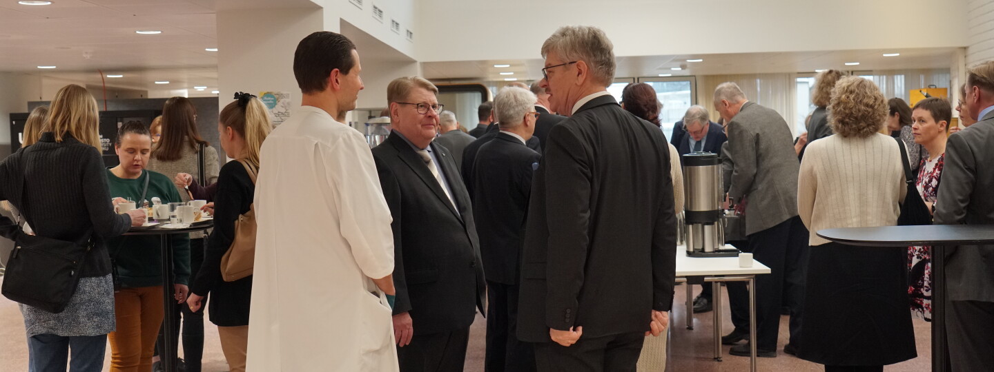 Anatomian professori, yliopistokollegion entinen puheenjohtaja Juha Peltonen jää eläkkeelle 1.4. Eläköitymisen kunniaksi järjestettyyn tilaisuuteen osallistui laaja joukko kollegoita, tiedekunnan ja yliopiston hallinnon edustajia, ystäviä ja perheenjäseniä.