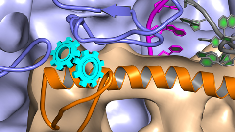 Taiteilijan näkemys turkulaistutkijoiden selvittämästä CBR-antibiootin toimintamekanismista. CBR-antibiootti on piirretty kuvaan hammasrattaaksi. CBR:n teho perustuu sen kykyyn estää geeniluennan kontrollisignaalien välittyminen RNA-polymeraasiin, violeteilta alueilta oranssiin kierteeseen.