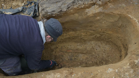 Filosofian maisteri Anne-Mari Liira kaiva haudan pohjalta esiin lapselle kuulunutta reisiluuta.