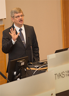 Dekaani Pentti Huovinen esitti huolensa kliiniseen tutkimukseen ohjattavan erityisvaltionosuuden leikkaamisen vaikutuksista lääketieteellisen tiedekunnan kansanedustajatapaamisessa 22.9.