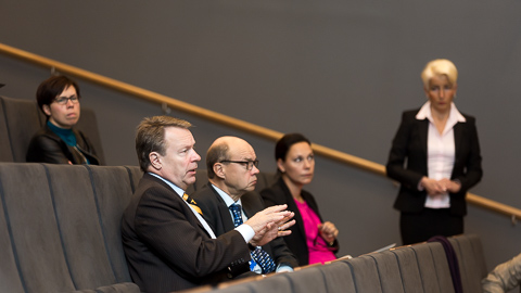 Kansanedustajat Heli Paasio (sdp.) ja Ilkka Kanerva (kok.), sairaanhoitopiirin johtaja Olli-Pekka Lehtonen, kansanedusja Anne-Mari Virolainen (kok.) ja lääketieteellisen tiedekunnan alumniyhdistyksen puheenjohtaja, hammaslääkäri Vivian Visnapuu.