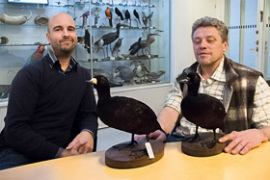 Kuvateksti: Kaunisto ja Karhilahti esittelevät, miten hankala harvinaista amerikanmustalintua (vas.) on erottaa sen lähilajista.