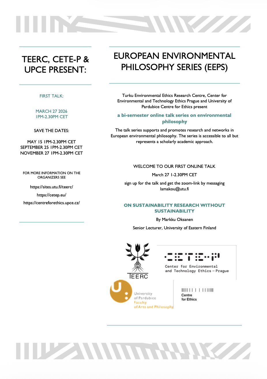 Turku Environmental Ethics Research Centre, Center for Environmental and Technology Ethics Prague and University of Pardubice Centre for Ethics present a bi-semester online talk series on environmental philosophy. The talk series supports and promotes research and networks in European environmental philosophy. The series is accessible to all but represents a scholarly academic approach.