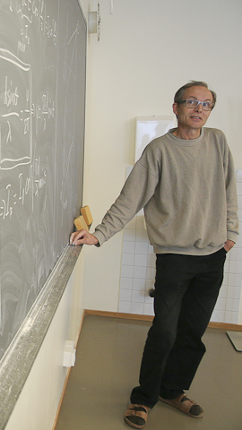 Kalevi Kokko piirtää taululle kaavoja ja vektoreita. Hän huomauttaa sivumennen, että se näyttää vähän monimutkaiselta, mutta kun otetaan huomioon tuo ja tämä, niin ihan helpoksihan tämä juttu meni.