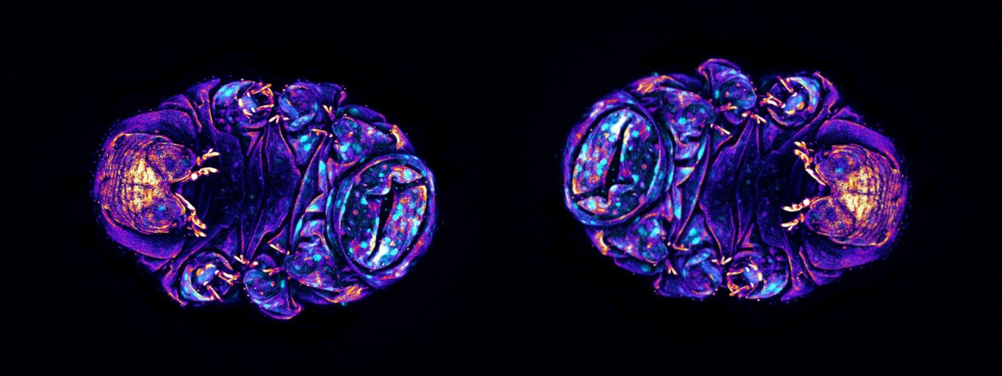 Mikroskooppikuva Anna-Mari Haapanen-Saaristo: Part of anoxia study of Eutardigrade species Macrobiotus Ripperi labelled with commercial fluorescent dyes, image acquired on 3i CSU-W1 Spinning disk with 40x objective