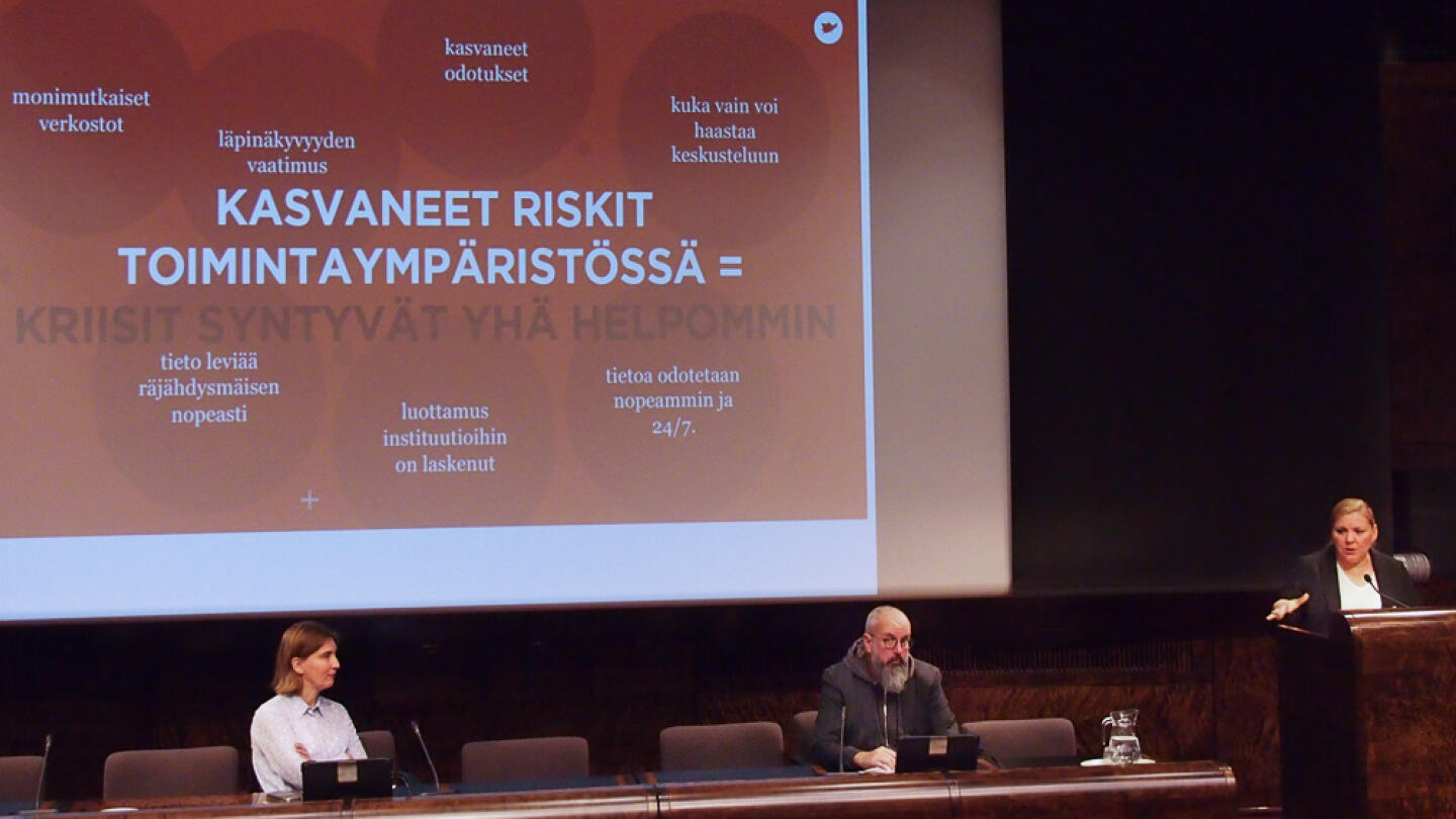– Tujusen jämäkkä esitys politiikan kriisiviestinnästä, Parkkosen politiikan toimittajan työtä ja sen hektisyyttä inhimilliseltä näkökulmalta valottanut puheenvuoro ja Anu Kantolan asiat historialliseen kontekstiin asettanut tutkimuksellinen katsaus olivat hieno yhdistelmä tutkimusta, journalismia ja poliittista viestintää, kertoo Honkasalo.