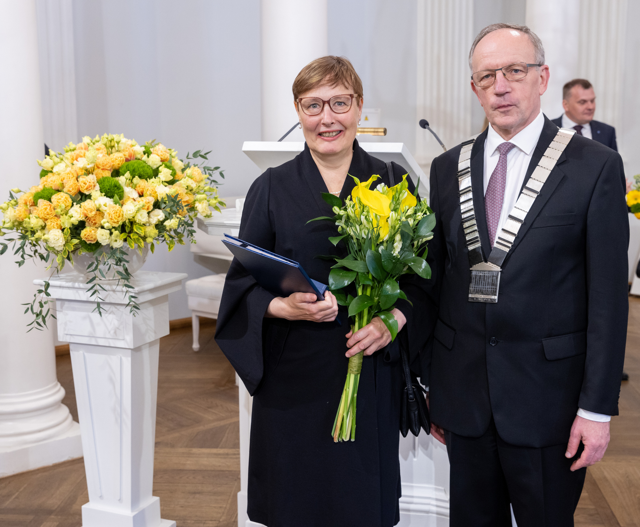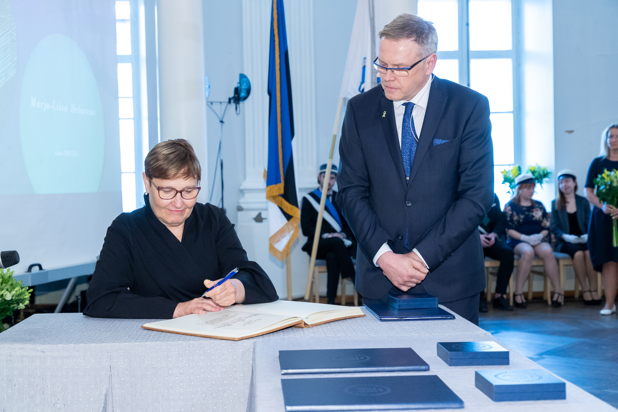 Helasvuo ja Tarton yliopiston rehtori Toomas Asser promootiotilaisuudessa 27.5.2022. Kuva: Andres Tennus / Tarton yliopisto.
