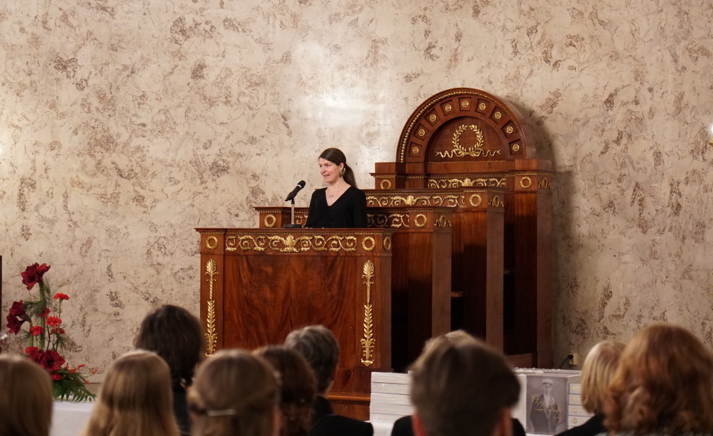 Viestintäjohtaja Anne Paasi kertoi, että humanistinen tiedekunta oli läsnä jo yliopiston syntysanoja lausuttaessa vuonna 1917. Kuva: Minna Nerg / Turun yliopisto.