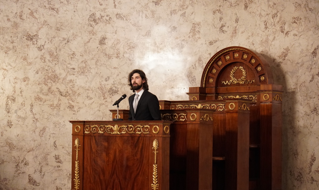Vastavalmistunut maisteri Otto Tarkka kertoi osallistuneensa opintojensa aikana lukuisiin tapahtumiin ja tavanneensa lukuisia ihmisiä, mutta myös oppineensa paljon asioita maailmasta. Kuva: Minna Nerg / Turun yliopisto.