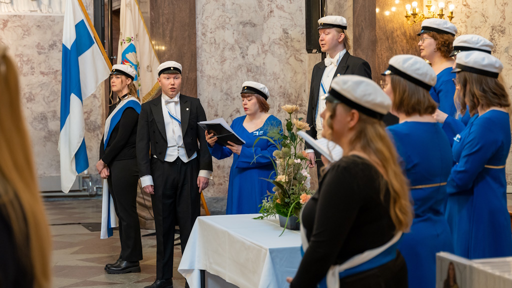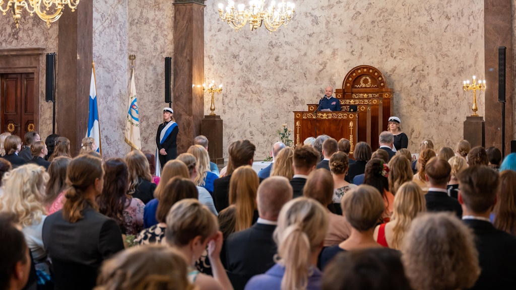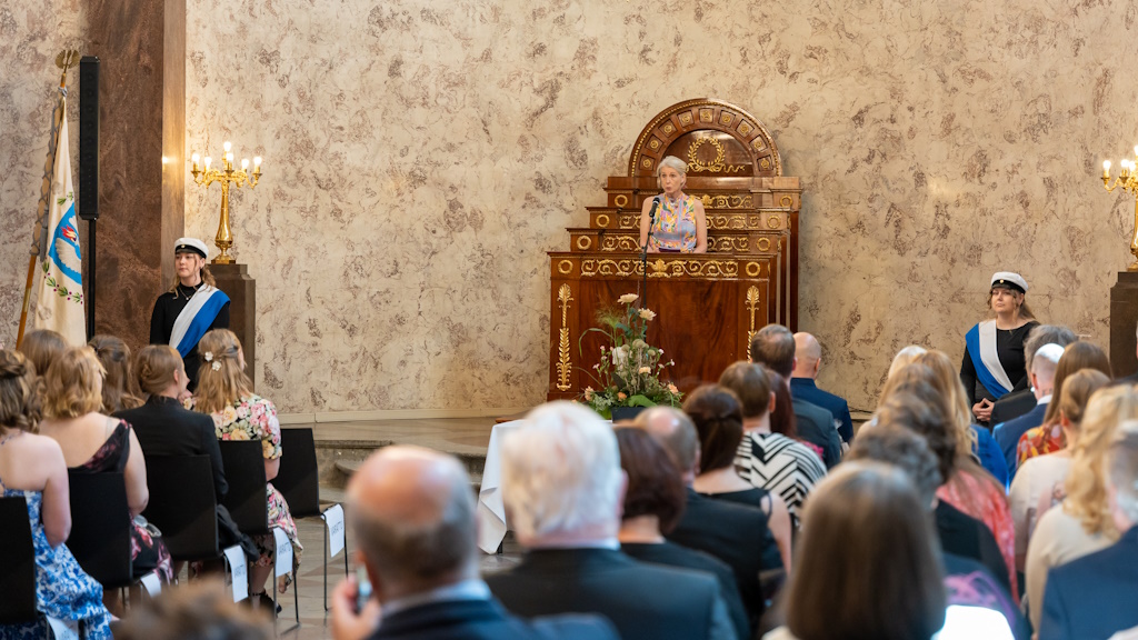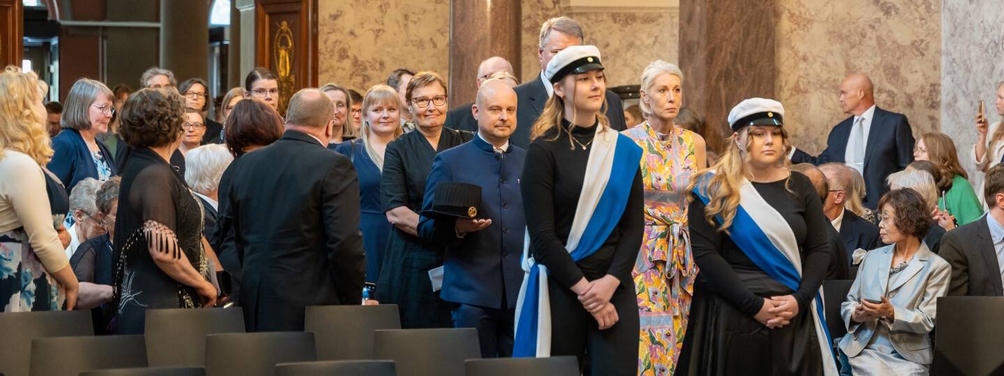 Humanistisen tiedekunnan publiikissa 13.6.2023 Akatemiatalossa juhlistettiin uusia filosofian maistereita. Yhteiskuntasuhdejohtaja Leena Wahlforsin ja dekaani Jaakko Suomisen lisäksi tervehdyksensä vastavalmistuneille toivat alumni Nelli Laihinen ja FM Aino Jämsä.