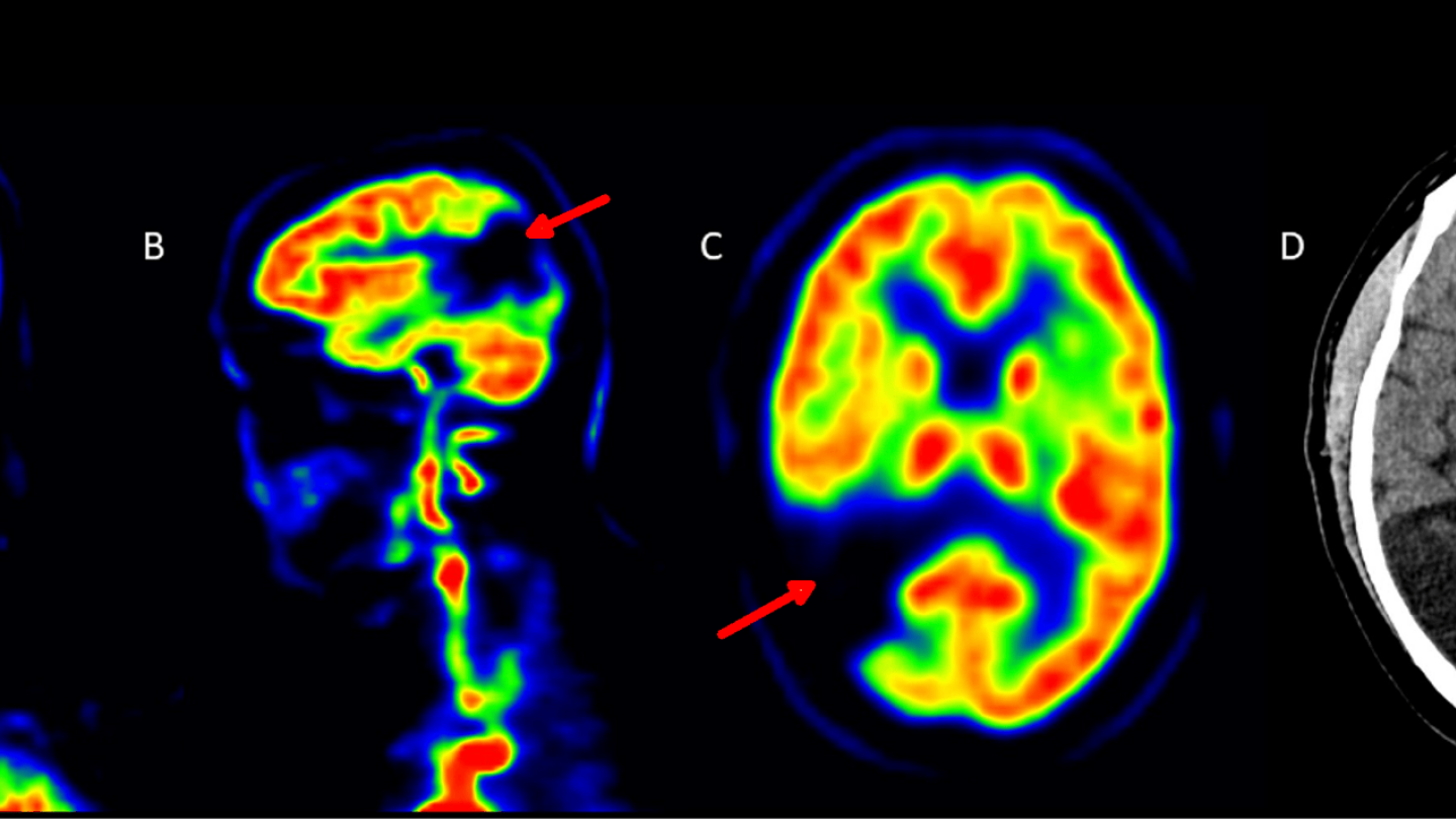 Aivoinfarkti näkyy nuolen osoittamissa paikoissa aivojen PET-kuvissa eri suunnista katsottuna. Oikeanpuoleisin kuva esittää vaurioalueen myös röntgentietokoneleikekuvassa.