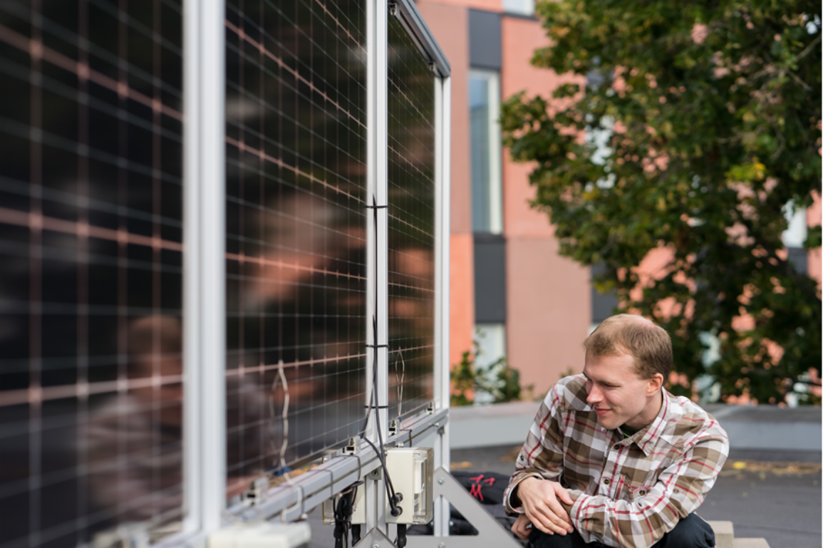 Pystyyn asennetut kaksipuoliset aurinkopaneelit mahdollistavat aurinkosähkön tuotannon aamu- ja ilta-auringosta. Kuvassa aurinkosähkön taloudellista kannattavuutta Turun yliopistossa tutkiva Sami Jouttijärvi tarkastelee pystyyn asennettuja kaksipuolisia aurinkopaneeleja Turun AMK:n katolla. Kuva: Mikael Nyberg / UTU.
