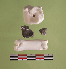 Kuvateksti: Varhaisinta karjataloutta tutkitaan pienten luunmurujen avulla. Kuvassa keskellä lampaan palaneita luunsiruja, joita vastaavat ehjät luut niiden ylä- ja alapuolella.