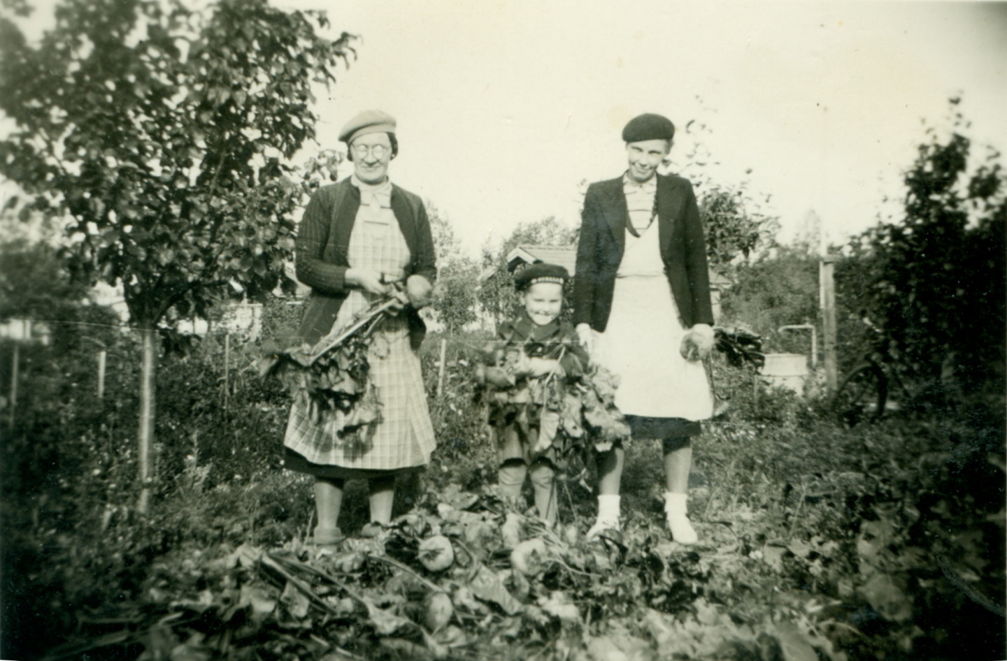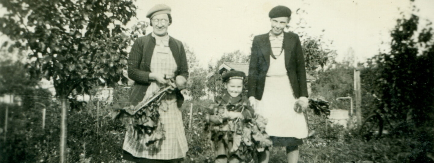 Kolme sukupolvea maasta nostettujen nauriiden äärellä. Kuva on otettu Kunnallissairaalantielle päin noin vuonna 1942. Kuva: Markku Varnilan kokoelma.