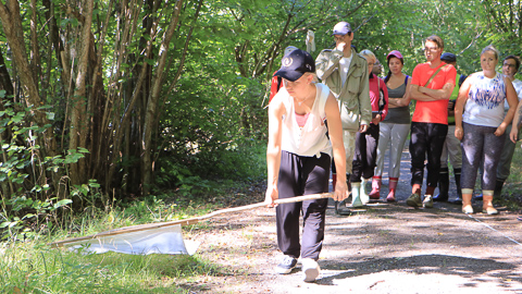 Charlotte Sievänen vetää 100 metrin matkan puutiaislakanaa, ja sen jälkeen koko kurssilaisjoukko tutkii yhdessä, jäikö lakanaan puutiaisia ja jos niin ovatko ne toukkia, nymfejä vai aikuisia.