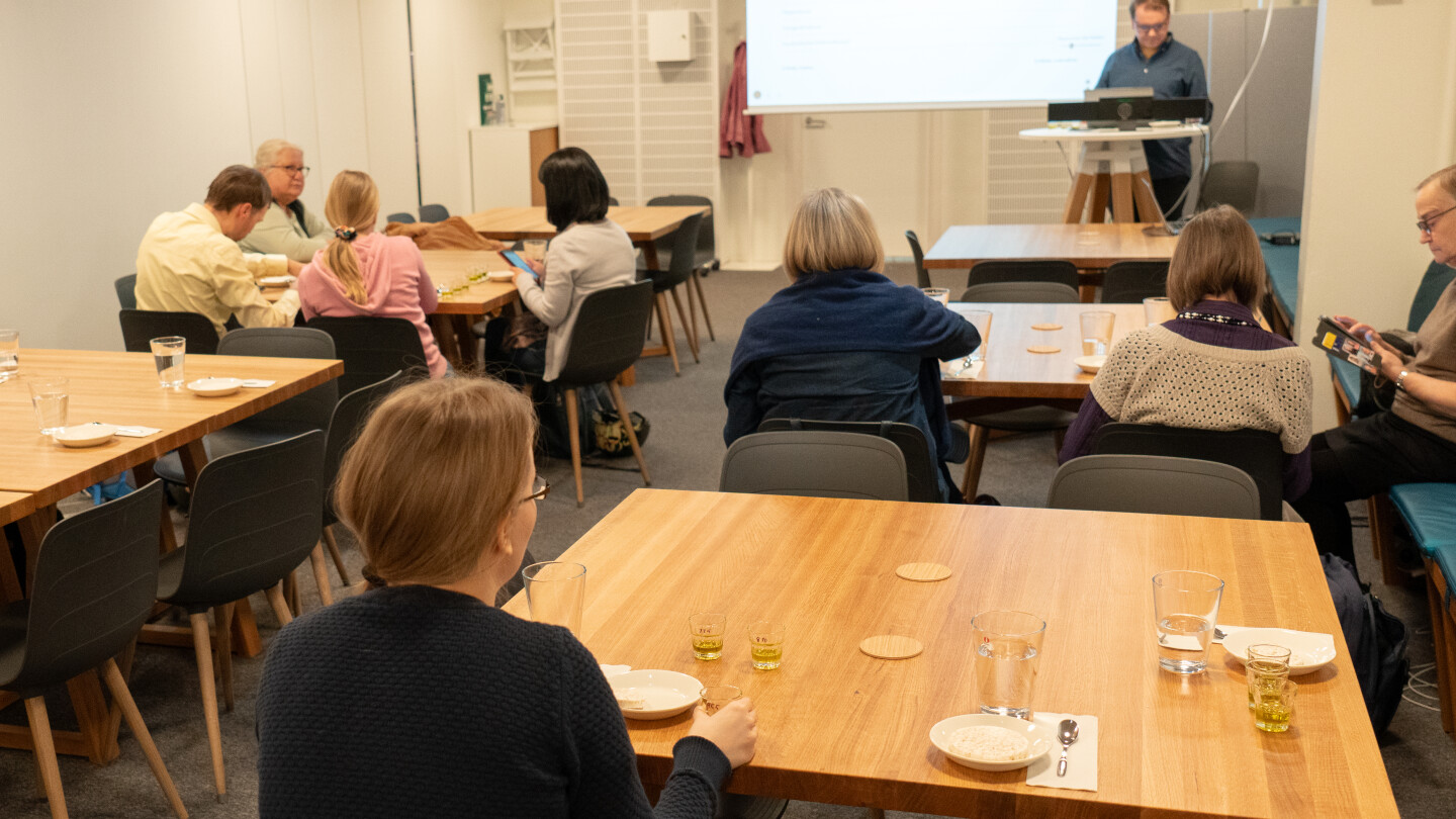 Arviointien jälkeen päästiin kuulemaan lisää oliivin kasvattamisesta ja eri lajikkeista, kun vieraileva luennoitsija, Terveyden ja hyvinvoinnin laitoksen tutkija Heli Kuusipalo kertoi ystäviensä kanssa omistamastaan oliivipuutilasta Keski-Italiassa. Kuusipalo kertoi oliivipuiden hoitamisesta ja sadonkorjuusta sekä eri tekijöistä, jotka vaikuttavat oliivisadon sekä lopputuotteena olevan oliiviöljyn makuun.