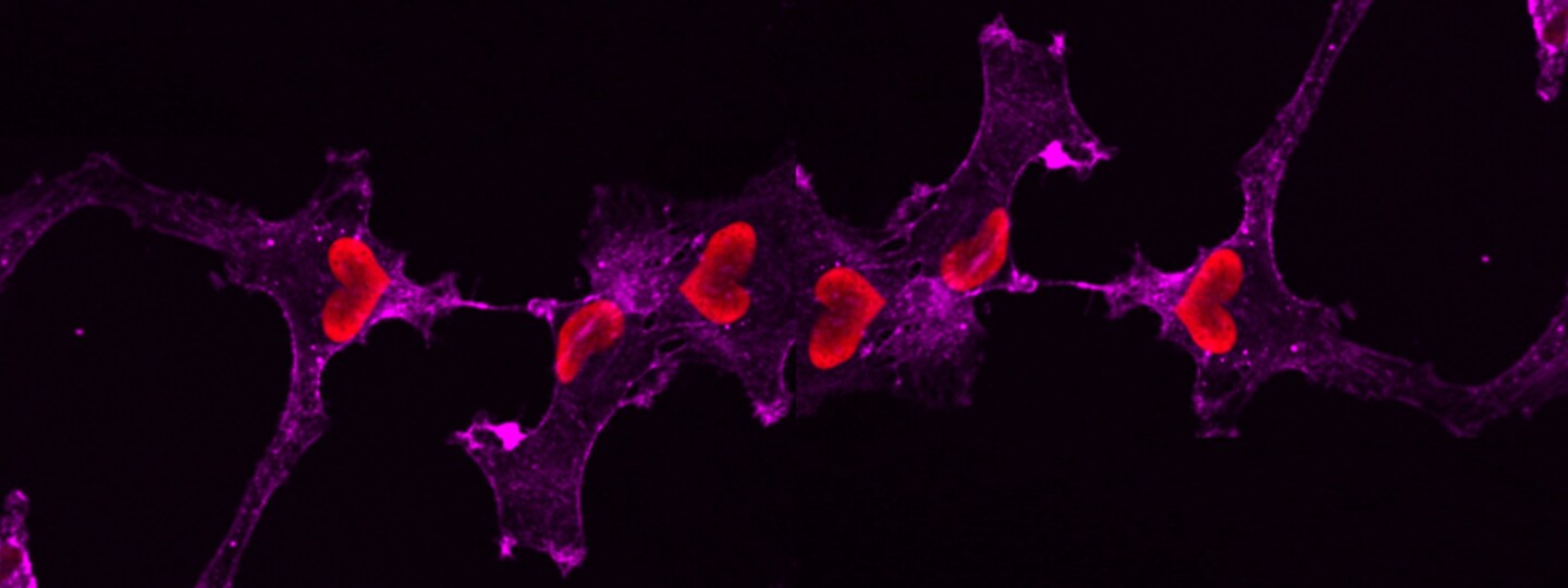 Mikroskooppikuva Jenny Pessa: Transformed human breast epithelial HS578T cells (flattened), labelled with commercial fluorescent antibodies. Image acquired on 3i CSU-W1 Spinning disk with 40x objective.