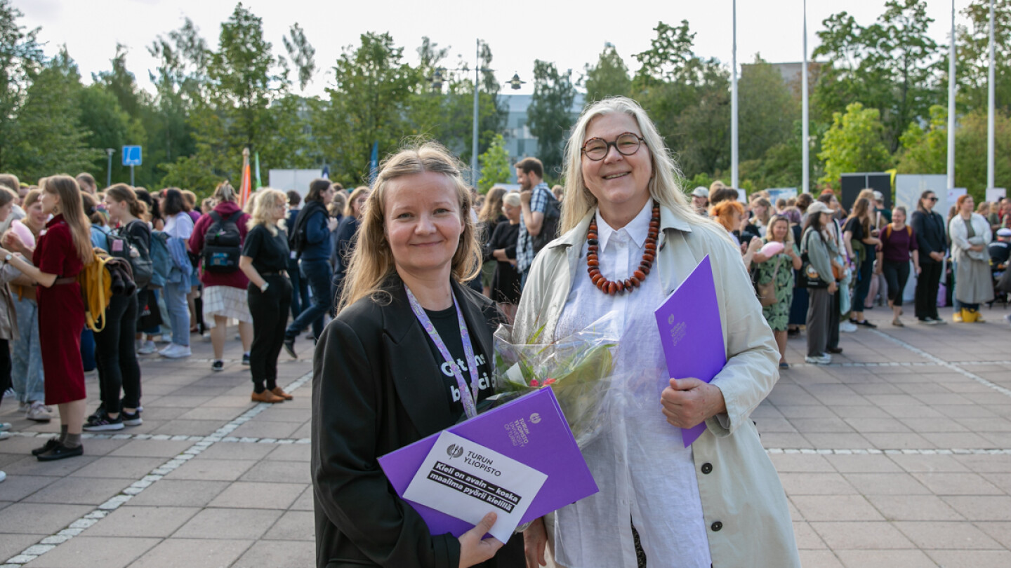 Yliopisto-opettaja Hanna Holttinen ja koordinaattori Terhi Amberla ottivat yliopiston avajaiskarnevaaleilla vastaan Vuoden kieliteko 2023 -palkinnon. Kuva: Suvi Harvisalo / Turun yliopisto.