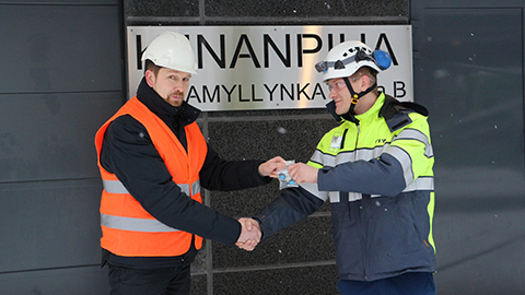 Isännöitsijä Esa Suovanen vastaanotti Kiinanpiha-rakennuksen avaimet työmaainsinööri Juuso Liljalta 15.1.2015.