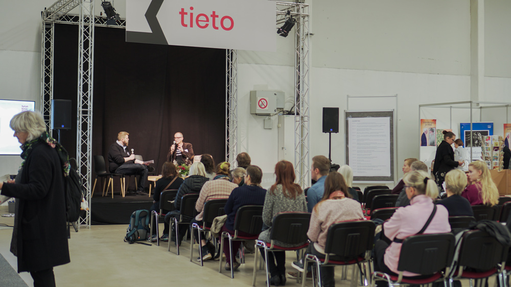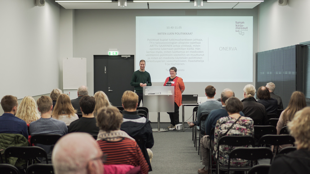 Turun yliopiston lavaohjelmassa kuultiin ajankohtaisia asiantuntijahaastatteluja. Onerva-salissa Erja Hyytiäisen haastateltavana oli taloussosiologian yliopisto-opettaja Arttu Saarinen.
