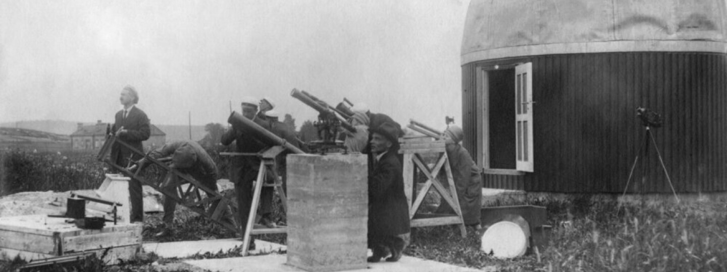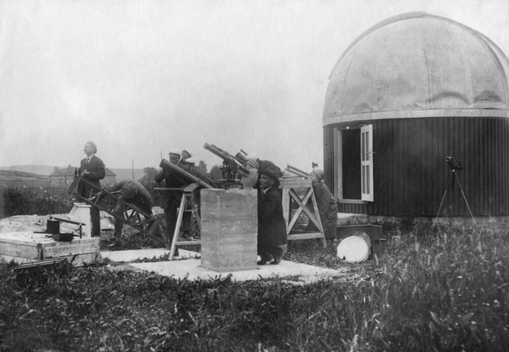 Väisälä (vas.) tutkimusryhmän kanssa Iso-Heikkilän observatoriolla. Ennen observatorion perustamista Väisälän kerrotaan tutkineen tähtiä omilla kaukoputkillaan rakennusten katoilla Turun keskustassa. Yliopisto sijaitsi tuolloin Kauppatorin vieressä. Kuva: Turun yliopiston arkisto.