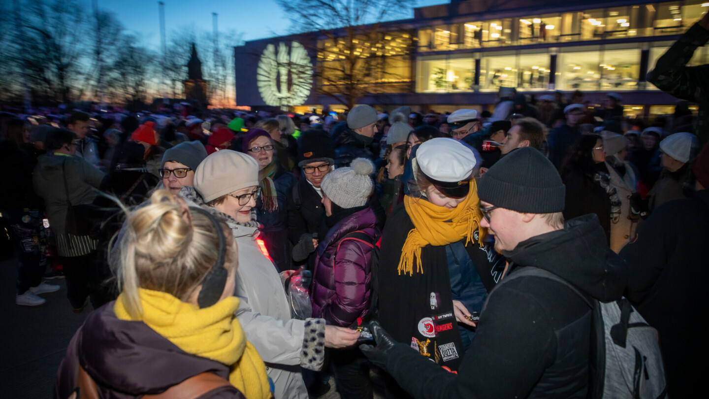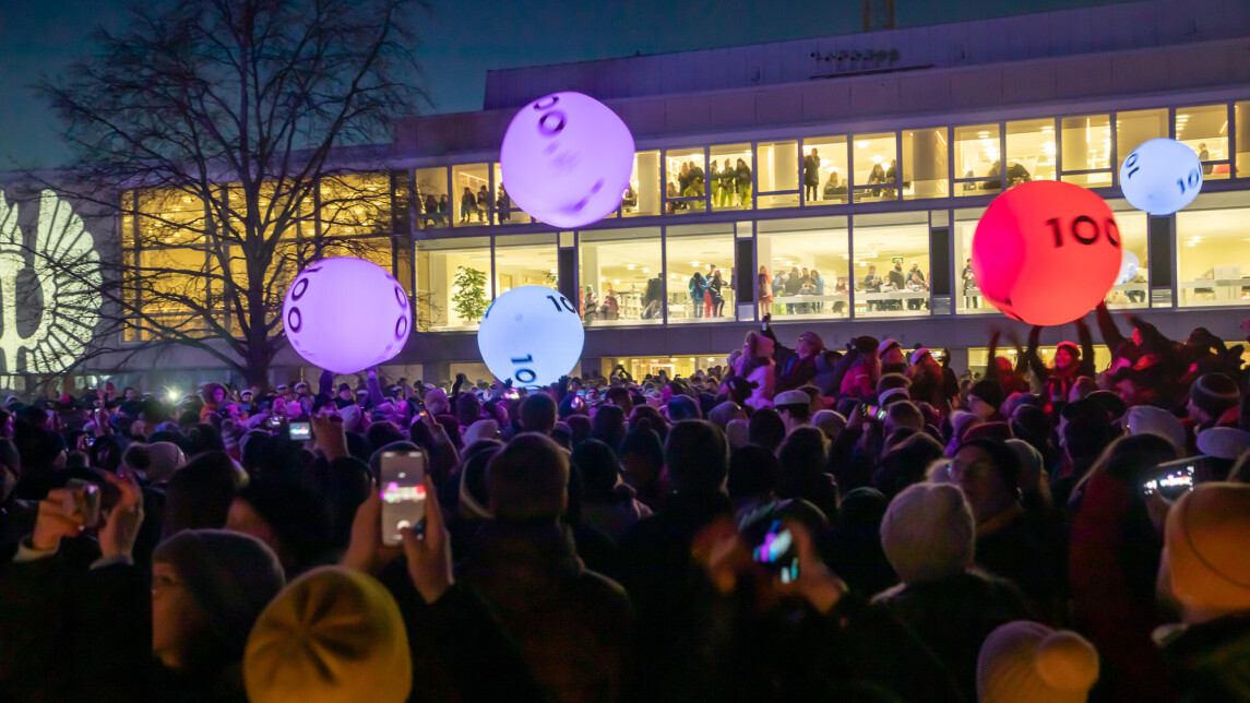 Synttäreillä opiskelijat piirittävät Riitta Pyykön saadakseen ainutkertaiset 100-vuotishaalarimerkit. Pyykön mukaan yksi iloisimmista asioista juhlavuotena oli, miten innokkaasti opiskelijat osallistuivat eri tapahtumiin.