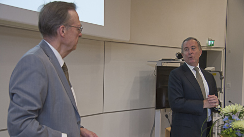 Lääketieteellisen tiedekunnan tuoreen kunniatohtorin Terry Dwyer (oik.) innosti dekaqani Tapani Rönnemaata ja muuta yleisöä miettimään, mitä nykyisin sanottaisiin aikuisille, jotka ottaisivat kouluista tietämättömän heimon lapset pihalta leikkimästä ja istuttaisi paikalleen kuudeksi tunniksi päivässä. - Antakaa lasten tehdä fyysisiä harjoitteita, Dwyer sanoi.