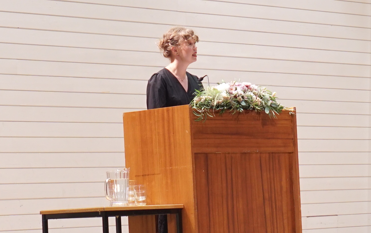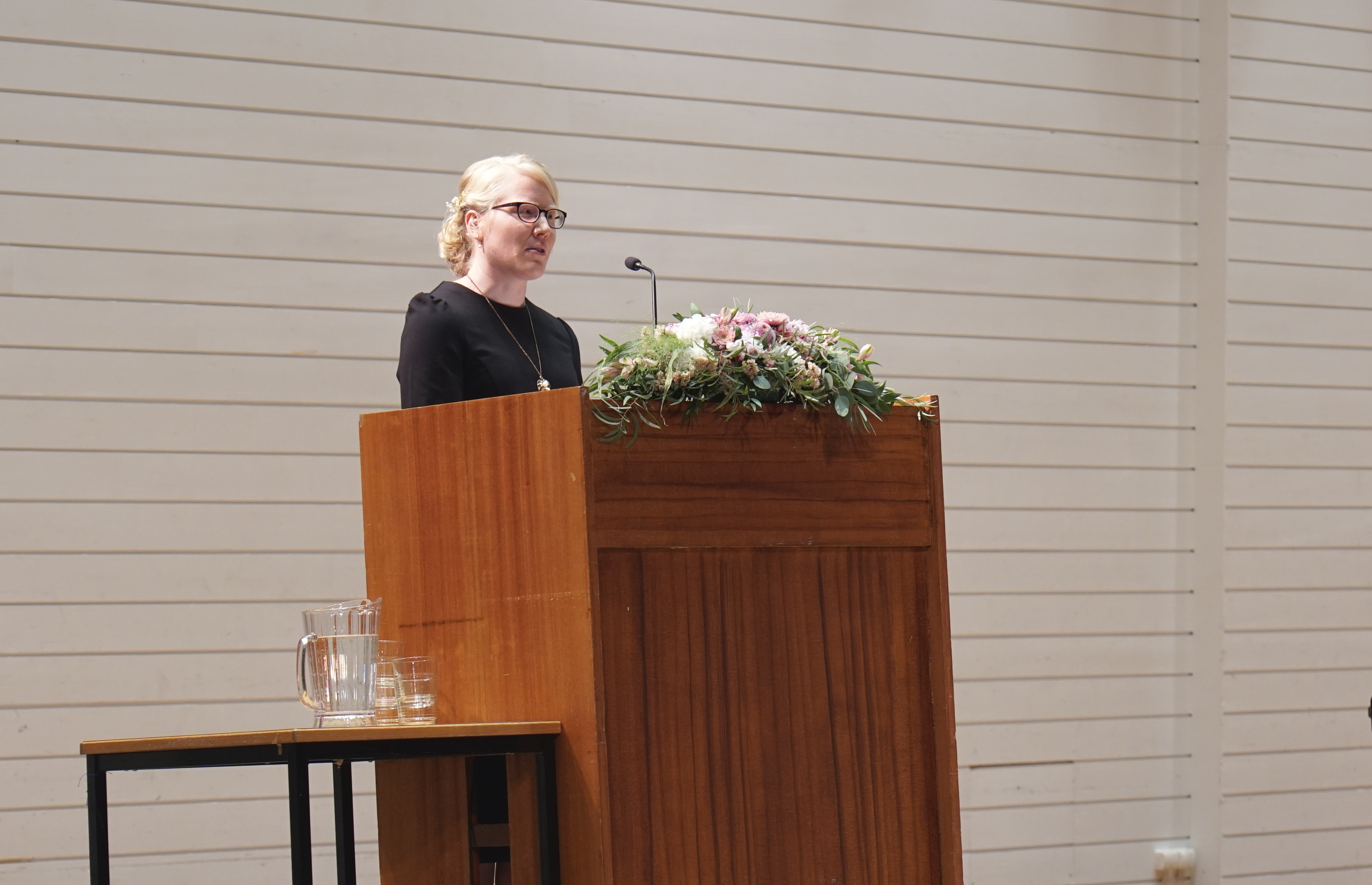 TtM Johanna Finskas pitämässä puhetta valmistuneille terveystieteiden maistereille.