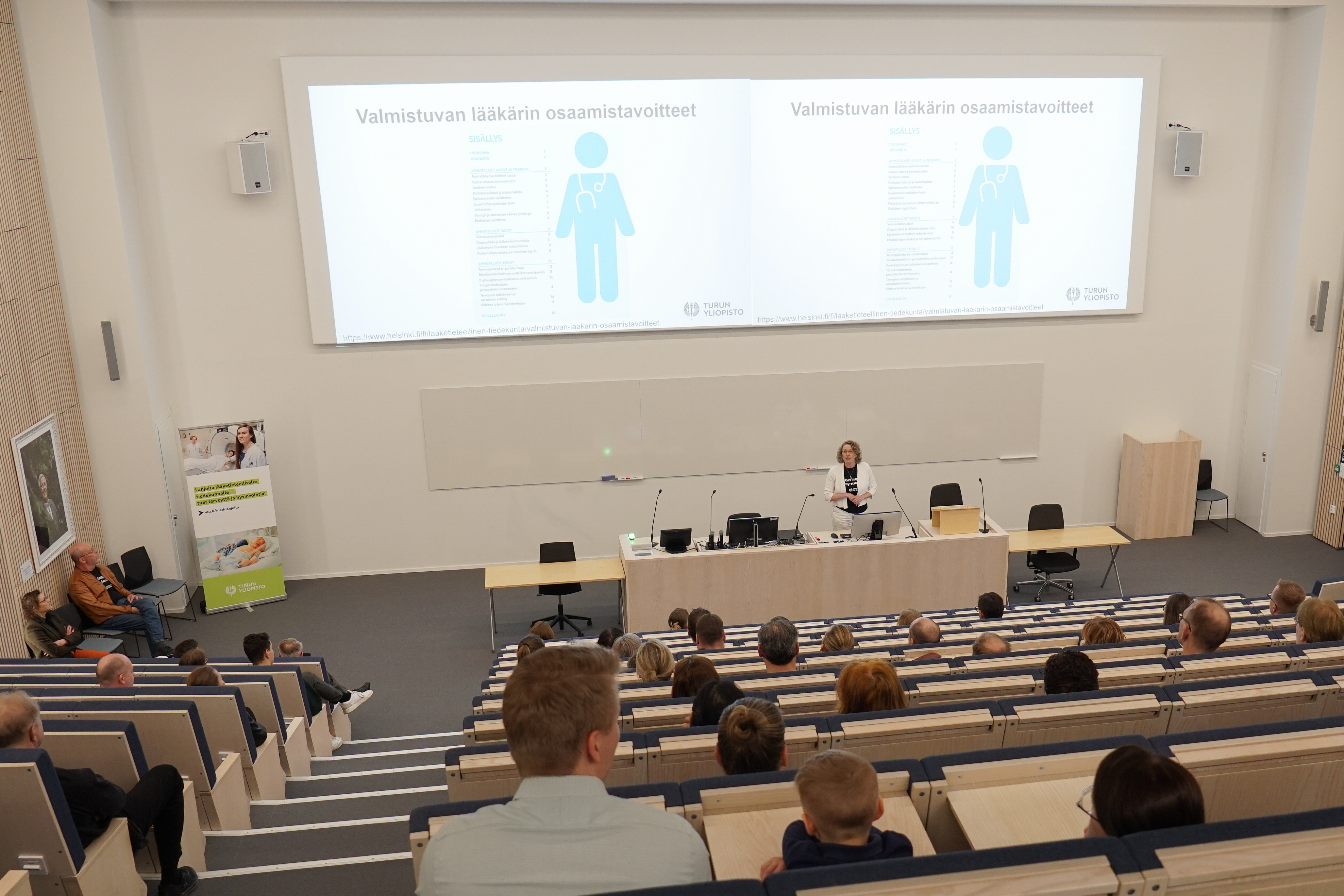 Lääkärikoulutusta esitellyt varadekaani Eriika Savonoja kuvasi puheenvuorossaan opintokursseja ja opintojen osaamistavotteita,