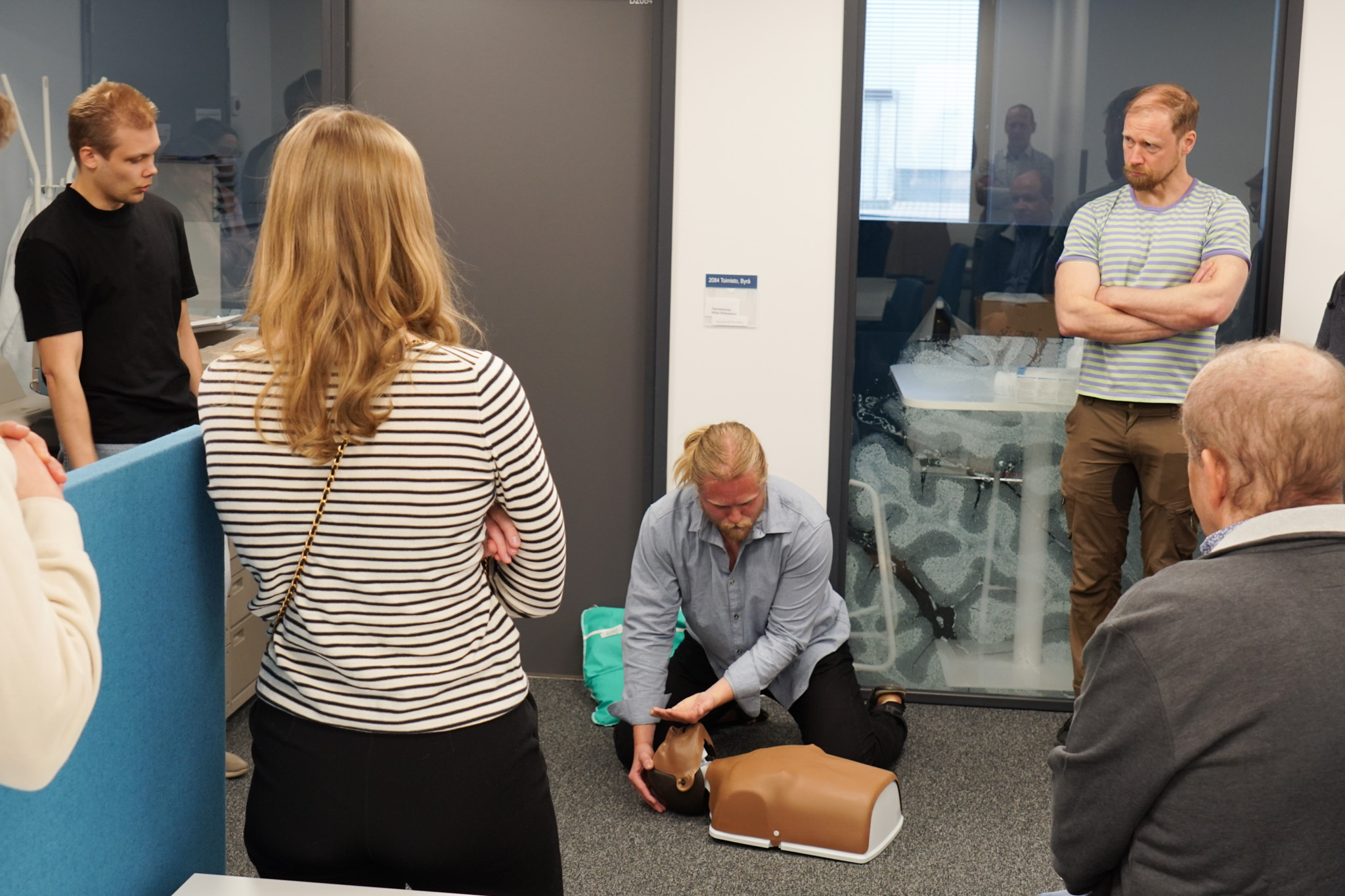 Yliopisto-opettaja Miretta Tommila ja opiskelija-avustajat esittelivät halukkaille Medisiina D -rakennuksen modernit simulaatiotilat, SimuCenterin. Lisäksi kierrokselle osallistuneille annettiin elvytysopetusta ja mahdollisuus kokeilla paineluelvytystä elvytysnukkejen avulla.