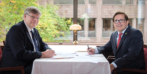 Turun yliopiston rehtori Kalervo Väänänen (kuv. vas.) ja lääkintöneuvos Sakari Alhopuro ovat allekirjoittaneet sopimuksen lahjoitusprofessuurista. Sopimus on kolmivuotinen ja siihen on kirjattu lisäksi kahden vuoden optio. Professuurin kustannukset ovat 100 000 euroa vuodessa.