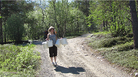 Kesän saapuminen pikavauhtia on pakottanut myös työntekijät kiristämään tahtia. Tutkimusavustaja Heini Koivuniemi kantaa kasvatuksessa olevia mittarintoukkia toiseen paikkaan.