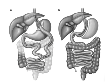 Kuva esittää käytössä olevien kahden eri lihavuusleikkauksen periaatteita. Vasemmassa kuvassa mahalaukun ohitusleikkauksessa ruokatorven alaosa yhdistetään ohutsuoleen. Viereisen kuvan sleeve-leikkauksessa mahalaukkua pienenetään, jolloin kerralla syötävän ruuan määrä pienenee.