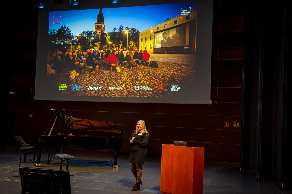Kulttuurikampus Turku, kulttuurialan yhteinen toiminta-alusta niin tutkijoille, opettajille, yrityksille, kolmannen sektorin edustajille kuin muillekin kulttuurialan toimijoille, esittäytyi Sigyn-salissa perjantaina 4.11.2022. Kulttuurikampuksen johtoryhmän puheenjohtajana kaksi vuotta toiminut Turun yliopiston koulutuksesta vastaava vararehtori Piia Björn avasi kampuksen toimintaa esittelevän verkostoitumistilaisuuden.