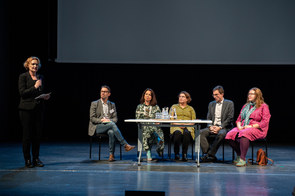 Tilaisuuden päättäneessä, Turun yliopiston työelämäprofessori Riitta Monton juontamassa paneelikeskustelussa pohdittiin, miten kulttuurialan ammattilaisille saataisiin lisää elintilaa Varsinais-Suomessa. Lavalla Jere Pensikkala (Taiteen talo), Laura Päiviö-Häkämies (Turun musiikkijuhlat), Petra Tarjanne (TEM), Henri Terho (Taike) ja Terhi Väänänen (Pyjama Films Oy).