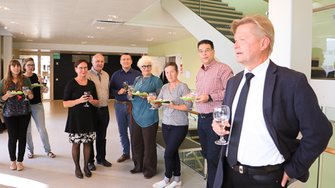 Varadekaani Heikki Hämäläinen (oik.) onnitteli Eira Jansson-Verkasalon (3. vas.) johtamaa logopedian oppiainetta sekä uudesta Proferros of Practicesta että eurooppalaisen erikoistumiskoulutuksen intensiivijakson järjestämisestä Turussa.