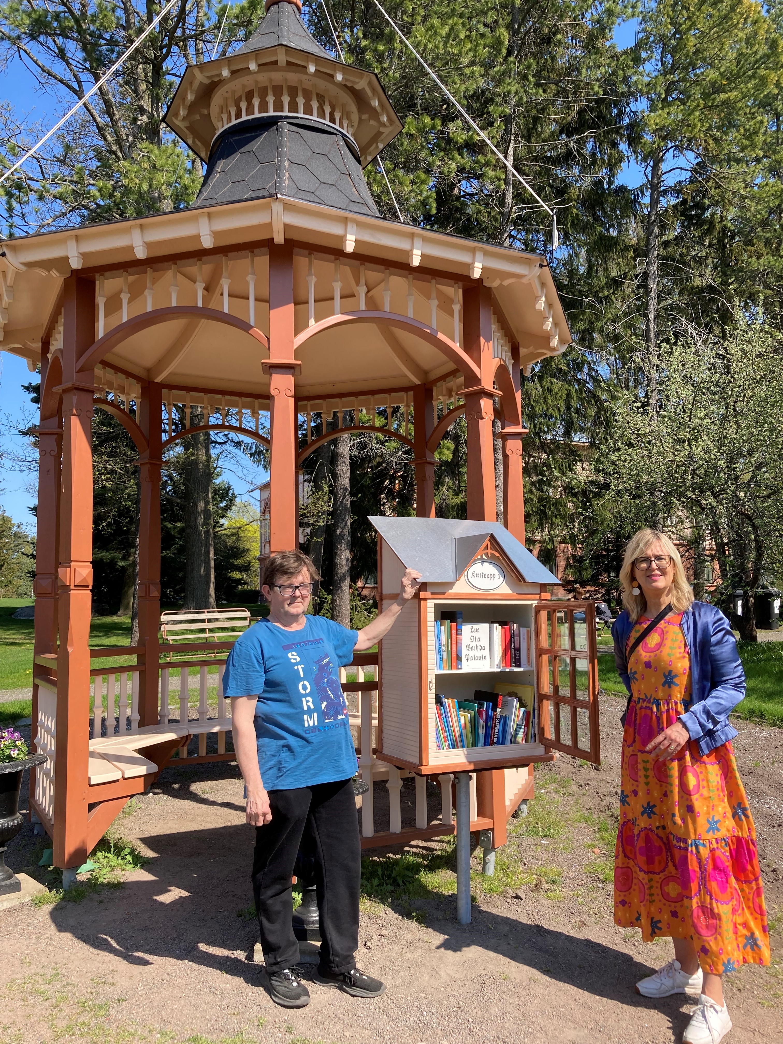 Kirjaa voi lukea lähistöllä, tai napata vaikka mukaansa ja palauttaa myöhemmin.
